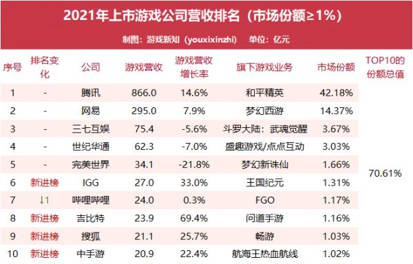 对比2020年年报,市场份额超过1%的游戏公司从7家上升到10家。新进入榜单的游戏公司包括IGG、吉比特、搜狐和中手游,挤出榜单的则是游族网络 (0.86%)。