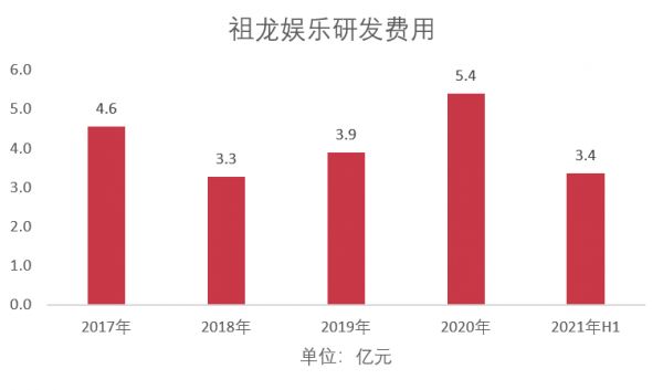 在2018年开始,祖龙娱乐的研发费用也是一路攀升,到2020年已经超过5.4亿,达到近4年的峰值;2021年上半年达到3.4亿,年终有望再创新高。
