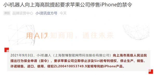9月7日,小i机器人官微发布消息称,9月3日,小i机器人(上海智臻智能网络科技股份有限公司)向上海市高级人民法院提出行为保全申请(禁令),要求苹果公司立即停止涉及Siri的专利侵权,停止生产、销售、许诺销售、进口、使用,侵犯ZL200410053749.9发明专利的iPhone产品。