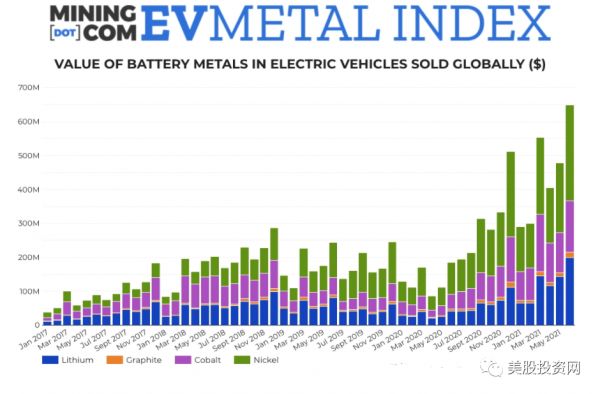 2021年6月登记的电动汽车电池金属价值为6.49亿美元,同比增长237%。