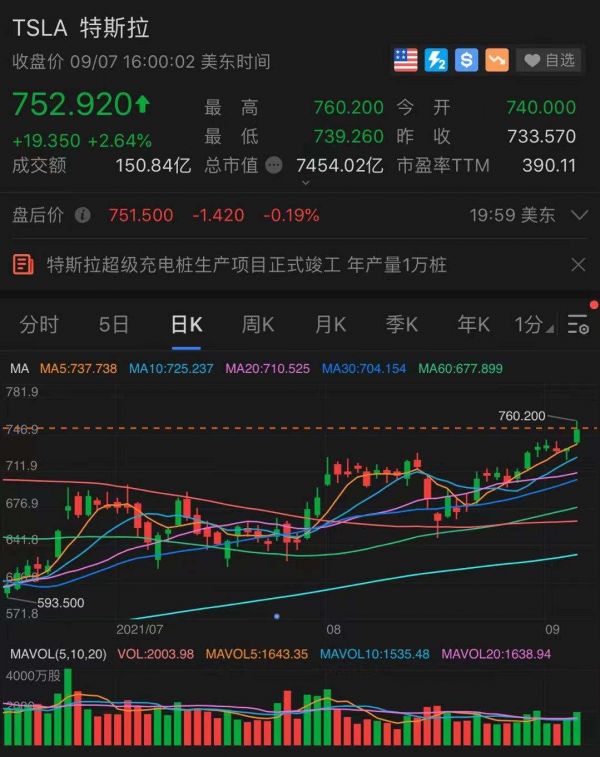果然,特斯拉这周出现多个利好,符合了我们上周五的文章这个华尔街交易员可能疯了,交易了1.2亿特斯拉看涨期权,今日特斯拉领涨龙头科技股,大涨4%,现报752.9美元,创5个月以来最高收盘价。