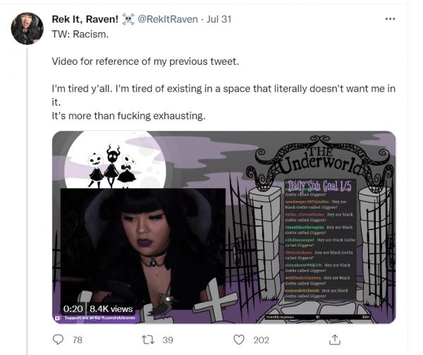 Raven抱怨, 这样的情况已经不是第一次出现,6月份以来频率不断增加,她已经不堪其扰。 为了寻求帮助,7月份时,Raven在Twitter上发布了一则直播录屏,画面中直播间的评论区被种族歧视的言论占据: “Hey, are black goths called Giggers?”