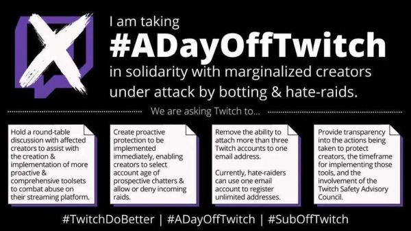 几周后的 9月1日,一些忍无可忍的主播们决定在这一天不上线、不直播,以示对Twitch平台治理仇恨言论不力的反抗。最终,这演变成了一场名为“A Day off Twitch”的活动,在美国互联网引发热议。