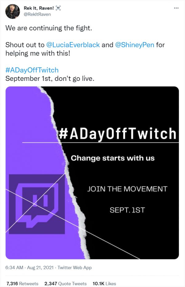 8月底,Raven和另外两位主播Shiney Pen以及Lucia Everblack决定,在9月1日这一天发起一场名为“A Day Off Twitch”的抵制行动,集体拒绝在Twitch上进行直播。他们希望通过这样的停播行为引起人们对于边缘化主播所遭受的仇恨言论的关注以及对平台的不作为行为表示抗议。