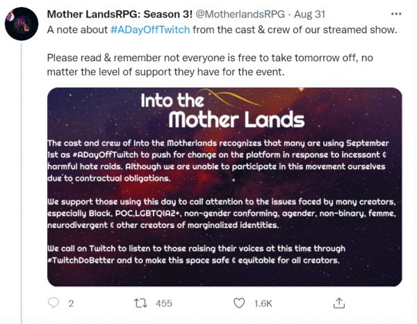 一些无法停播的主播也表达了对活动的支持。图片来源:Twitter@MotherlandsRPG