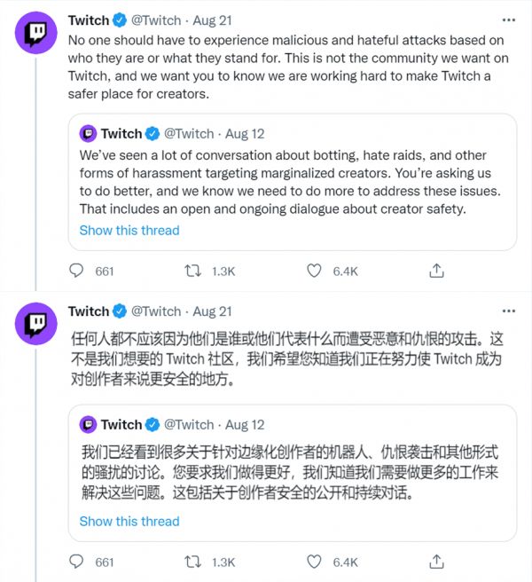 这位发言人表示,“平台对于主播表达自己的权利是完全支持的,任何人都不应该因为他们是谁或者他们代表什么而遭到仇恨和恶意的攻击,我们正在努力改进平台的安全机制,使Twitch成为一个安全的地方。”