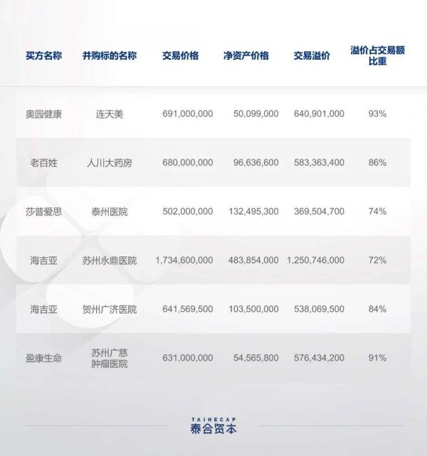 可以看出,在这些典型并购案例中,交易溢价占交易额的比重都高达70%、80%,甚至超过90%——这是医疗服务行业和其他行业的最显著差异:比起并购标的肉眼可见的净资产价值,买方更多会关注于企业“无形”的价值,愿意为这些“无形价值”付出相当高的溢价。