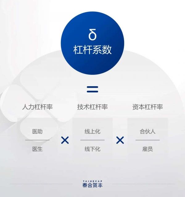 从上述公式可以看出,人效产能、折现率和服务期可以大致勾勒出人力资本的几个维度,但对希望规模化的连锁医疗服务机构来说,想要依靠人力资本实现规模化扩张,还要利用好杠杆来从线性增长迭代为指数级增长。杠杆系数来自于三类,分别是:人力杠杆、技术杠杆与资本杠杆。
