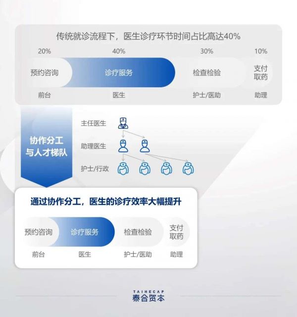 一个完整的诊疗包括了挂号预约、到诊取号、医生首诊、化验检查、诊断治疗、支付取号、随访复诊。我们将全流程所需时间定为100%,医生主要参与的首诊、诊断治疗、复诊三个环节在时间占比上可达40%,剩下的60%一般会由护士、医助、行政或运营支持人员来完成。
