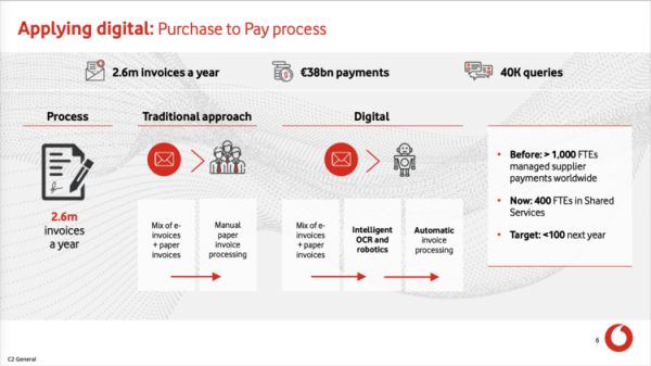 Frame.io 很酷,并且利用了当前生产力的一些趋势(Fred Wilson 早在 2014 年的时候就写过这方面的文章),但其中有很多可能只是一遍又一遍地进行“软件的现代化”。这方面我最喜欢的一个例子是沃达丰的这张幻灯片。沃达丰在很多国家/地区都有自己的移动网络,拥有数亿的客户,所以它每年要付款的发票有 260 万张。这一切都是“数字化的”(确实,而且可能是Oracle的,请注意,沃达丰不算是旧公司),但如果你今天是从零开始的话,你会怎么做呢?把类似的故事推广给到其他100家大型公司的话又会诞生出多少家初创企业呢?你可以打个赌,Google 的后台大概不会用 Oracle 或 SAP。