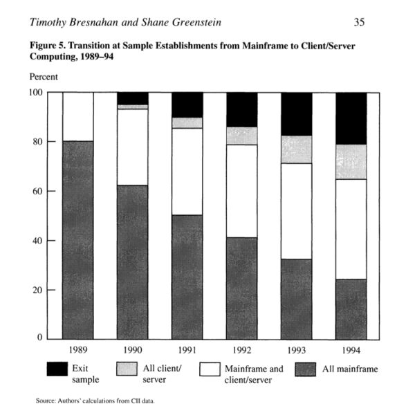 从大型机迁移到客户端/服务器并不不是仅仅意味着你从租用某种机器变成了买另一种机器——还意味着改变了整个计算的机制。尤其是,软件变成了一个独立的业务,有各种各样的新公司卖新软件给你,其中有的解决了现有问题,但有的改变了公司的运作方式。SAP 令准时制供应链变得容易多了,而后者令 Zara 和蒂姆·库克的苹果成为可能。新的软件类别促成了新的做生意的方式。