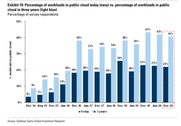 关注一下这个过程需要多长时间也很有趣。如果你是住在硅谷的话,很自然会觉得云计算跟SaaS已经过时,而且枯燥乏味,但高盛的这张图表展现的却是不同的情况,这张对大公司 CIO 的调查表明,迄今为止他们只有不到四分之一的工作流是上云的,而且移动化的速度也比他们预期的要慢。这些东西需要时间,而且你未必有预算或理由在一夜之间重建一切。