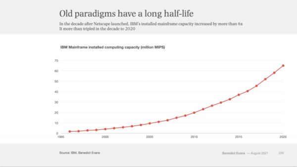 PC 与客户端/服务器模式不会消失,或者至少不会很快消失。同样地,今天入驻 YC 的那些创始人并不是硅谷的任何人最后一次能想到大型机时出生的,但 IBM 的安装基数(按计算能力衡量)仍在增长——事实上,IBM 去年的大型机出货量还创下了记录。尽管技术已经变得过时,但过时不代表没用,事实上,过时的技术往往会退回到自己的核心客户与核心用例,并提高价格。在一段时间内,这可能仍然是一笔很好的生意。