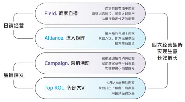 在FACT矩阵当中,商家自播和达人矩阵主要面向日常运营,营销活动和头部大V主要面向短期爆发。因为短期爆发具备制造热点的能力,所以外界往往误以为“直播电商就是一小撮头部大V的游戏”,忽视商家自播的重要意义。甚至连品牌商家自身也容易产生这种误解!