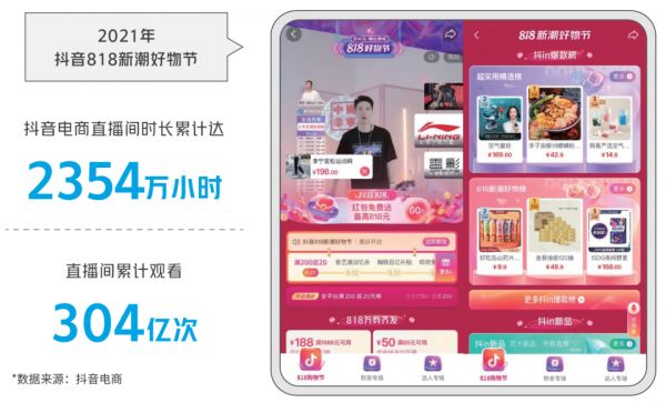 事实胜于雄辩,数据就是最好的证据:在刚刚过去的2021年抖音818新潮好物节,抖音电商直播间的累计时长达到了2354万小时,直播间累计观看量达到304亿次。