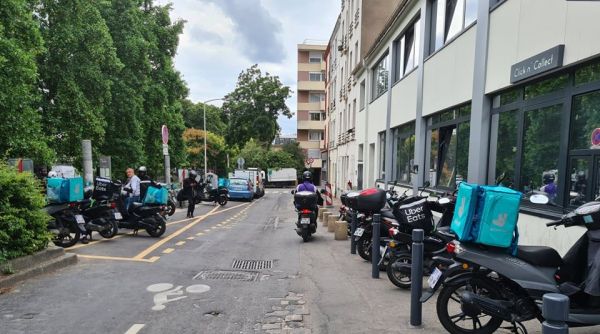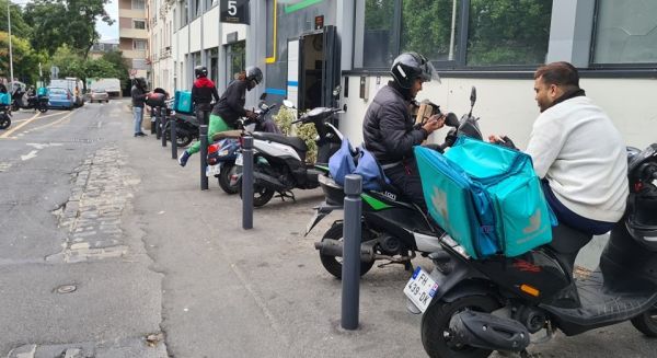巴黎郊区,分隔城市和郊区的环形公路之外,有一座灰色的、有棱有角的建筑。建筑外面,一群送货司机在摩托车上等待,后面放着Deliveroo和UberEats的外卖箱子。他们一个接一个地收取外卖,然后飞奔向目的地。