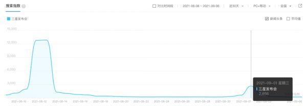 据连线Insight在百度指数榜搜索“三星发布会”显示,9月1日当天,三星发布会的搜索指数仅有2656,前后日期的搜索指数均为个位数。相比之下,苹果在9月8日凌晨公布发布会日期前,搜索指数就一路上升,如今已经超过1万。