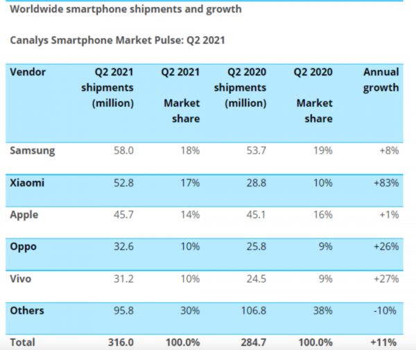 据市场研究机构Canalys发布了2021年第二季度全球智能手机市场报告显示,三星虽然依旧排名第一,出货量达到5800 万部,占据全球18%的市场份额,但小米紧跟其后,出货量达到5280万台,同比增长83%,占据全球17%的市场份额,第三名苹果也占据了全球14%的市场份额。