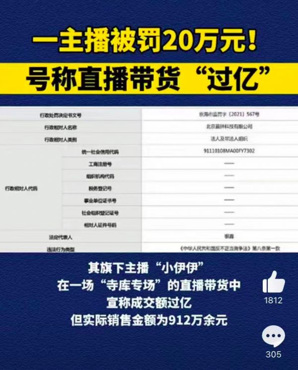 为了打破困境,寺库也曾进军直播风口,却在刚开始就被爆出数据造假。618期间,主播小伊伊主持的快手“寺库专场”宣称成交额过亿,实际上销售金额却仅为912万余元,最终被北京市市场监督管理局罚款20万元,信誉严重受损。