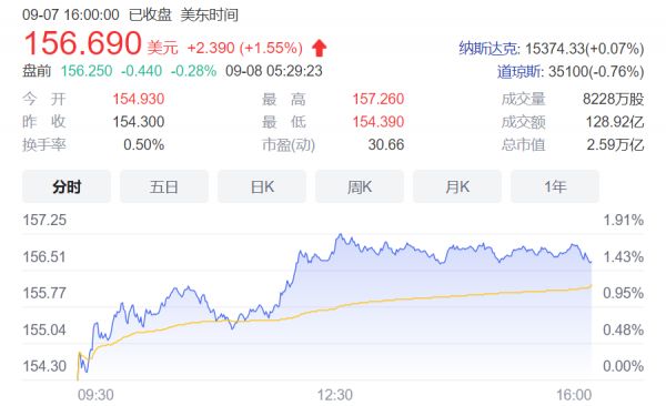 北京时间9月7日晚间,美股盘中,苹果股价再度大涨,最高报157.26美元/股。截至收盘,苹果涨1.55%,报收156.69美元/股,总市值近2.6万亿美元。