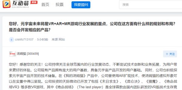当日汤姆猫收到深交所关注函,要求说明公司现有主营业务、主要产品与元宇宙概念的关联性,公司称“具备元宇宙产品开发用户基础”的原因、依据,是否具备统计数据、市场调研情况等客观证据支持,相关表述是否严谨、合理;公司是否存在利用互动易回复蹭热点、炒概念,配合股东减持的情形。