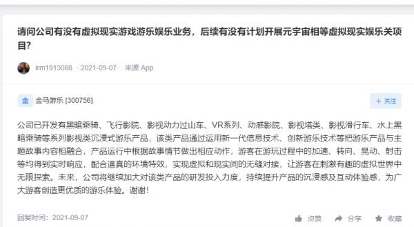 有投资者在互动平台上向金马游乐提问,“请问公司有没有虚拟现实游戏游乐娱乐业务,后续有没有计划开展元宇宙相等虚拟现实娱乐关项目?”9月7日,金马游乐表示,公司已开发一系列影视类沉浸式游乐产品,该类产品通过运用新一代信息技术、创新游乐技术等把游乐产品与主题故事内容相融合,产品运行中根据故事情节做出相应动作,游客在游玩过程中的加速、转向、晃动、射击等均得到实时响应,配合逼真的环境特效,实现虚拟和现实间的无缝对接。