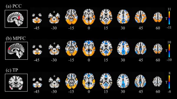 默认模式网络的三个节点与大脑其他区域的功能性连接图示。(a)在观看推荐算法所推荐的视频时,后扣带回皮质(posterior cingulate cortex)与初级视觉、听觉区域,以及一部分顶叶区域的功能性连接增强。(b)相同情况下,内侧前额叶皮层(medial prefrontal cortex)与前扣带回皮质(dorsal anterior cingulate cortex)等其他区域的功能性连接减弱。(c)颞极在颞上回内的功能性连接增强,与楔前叶、腹内侧前额叶皮质(ventromedial prefrontal cortex,vmPFC)等诸多区域的功能性连接减弱。[4]