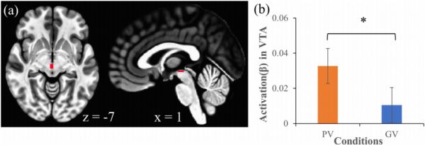 (a)腹侧被盖区在MNI脑模板上的位置。(b)相较一般视频,在观看算法推荐的视频时,腹侧被盖区的活跃程度显著更强。[4]