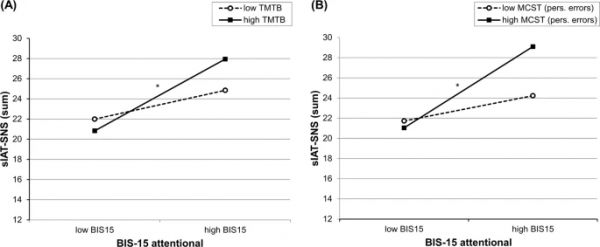 在两种执行功能测量(TMT-B、MCST)中,注意冲动(BIS-15)与网络成瘾(sIAT-SNS)表现出正相关.[14]