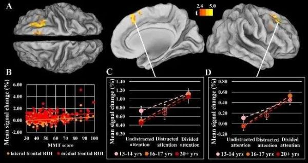 分心任务和大脑活动之间的联系。右半球前额叶皮层区域显示出媒体多任务(MMT)得分与分心注意条件下的大脑活动呈显著正相关(A)。[16]