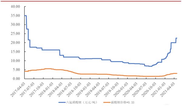 六氟磷酸锂的核心原材料主要是碳酸锂,单吨用量在0.33吨左右,按照目前碳酸锂含税12万元/吨的价格来计算的话,碳酸锂成本占比在40%以上。