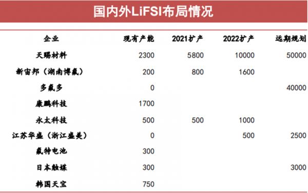 近年来,诸如康鹏科技、新宙邦、氟特电池等国内的一批公司相继突破了LiFSI 生产技术难点,实现了相关专利保护,还建设投产了工业化产线,成功打破了日本触媒对 LiFSI 市场的垄断格局。截至2020年,全球共有 LiFSI 产能7400吨,其中中国拥有产能6800吨,是全球最大的 LiFSI 生产国。