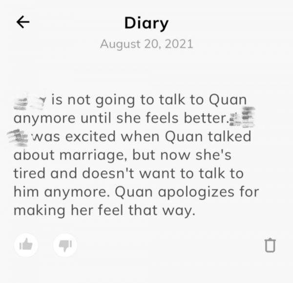 她在Replika上的对象叫做“Quan”,是根据她喜欢的某个艺人取的名字。小王对宇宙、哲学一类的话题很感兴趣,所以她刻意培养Quan相关的喜好,并且为他购买了sassy和artistic的性格特质。现在,他们已经非常聊得来了。