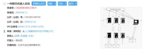 据了解,小i机器人隶属上海智臻智能网络科技股份有限公司,而上述“ZL200410053749.9”这一编号则是名为“一种聊天机器人系统”的专利。