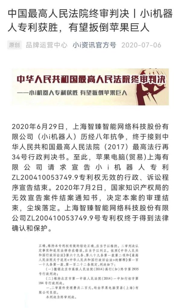 2020年7月6日,小i咨询官方号以“小i机器人专利获胜,有望扳倒苹果巨人”为题,宣布了公司在最高院的判决中获胜的消息。