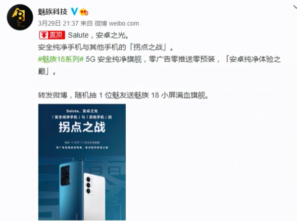 此前,小米11 Ultra正式对外发布,并且自称是安卓之光,是手机和相机之间的拐点之战。魅族这边则表示自己是安卓系统领域之光,是安全纯净手机与其他手机的【拐点之战】。虽然魅族说的是实话,但是这样的营销也被网友指出来是碰瓷,太有失魅族的风范了,看得多了,会让被人认为魅族18可能就三零系列这一个卖点。