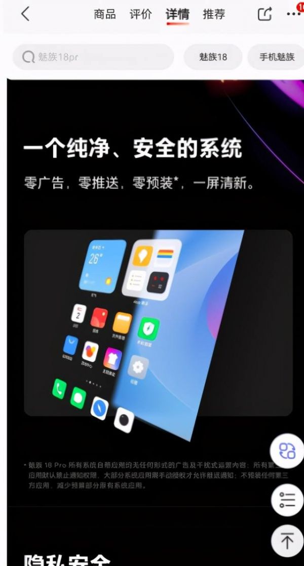众所周知,现在的手机品牌商为了降低成本会预装很多第三方应用,并且在浏览器或者副屏上都会有好多广告推送。而魅族18这次宣传的就是三零,实现了零广告、零预装第三方应用、零运营推送。