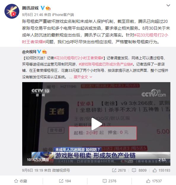 对此,9月6日,腾讯游戏回应,账号租卖严重破坏游戏实名制和未成年人保护机制,截至目前,腾讯已向超过20家账号交易平台和多个电商平台起诉或发函,要求停止相关服务。8月30日关于未成年人防沉迷的最新规定出台后,腾讯予以了坚决落实。针对花33元租号打2小时王者荣耀问题,我们也呼吁尽快出台相应法规,严格管制帐号租卖行为。