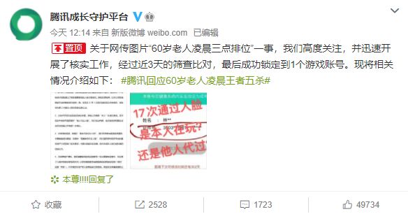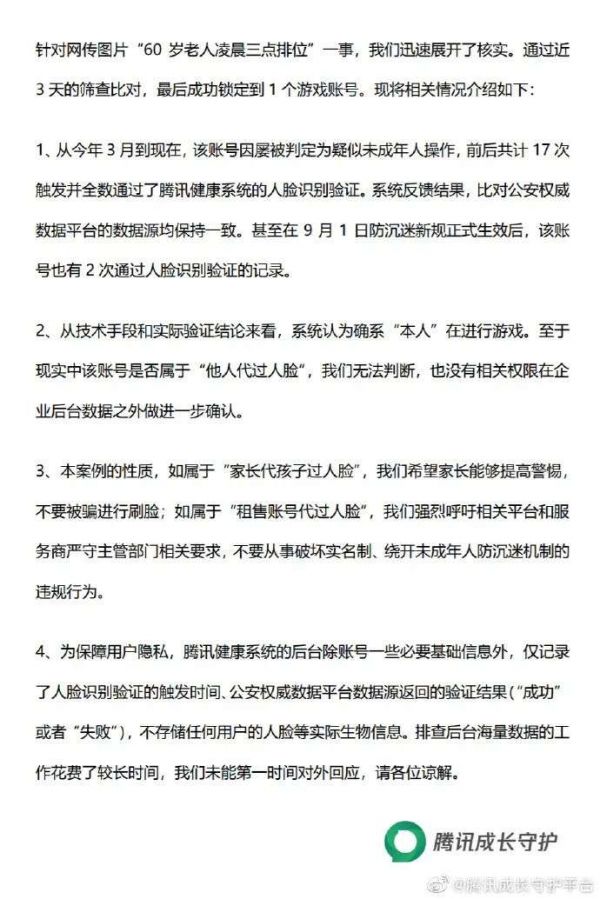 9月9日,@腾讯成长守护平台微博 发布公告就网传图片“60岁老人凌晨三点排位”一事作出回应,称经过近3天的筛查比对,最后成功锁定到1个游戏账号。从技术手段和实际验证结论来看,系统认为确系“本人”在进行游戏。至于现实中该账号是否属于“他人代过人脸”,我们无法判断,也没有相关权限在企业后台数据之外做进一步确认。