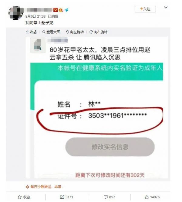 9月6日,网上流传“60岁老人凌晨三点排位”,这位游戏玩家被怀疑是未成年人。