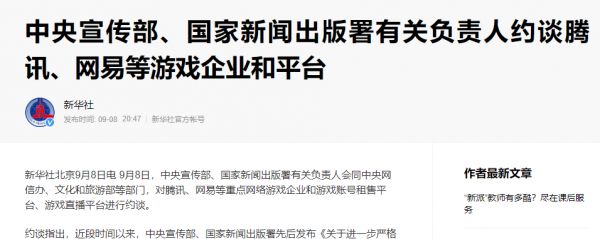 9月8日,中央宣传部、国家新闻出版署有关负责人会同中央网信办、文化和旅游部等部门,对腾讯、网易等重点网络游戏企业和游戏账号租售平台、游戏直播平台进行约谈。对此,腾讯、网易等企业进行了回应。