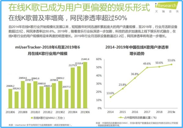 艾瑞咨询2020年发布的《中国在线K歌社交娱乐行业发展洞察白皮书》(简称“《白皮书》”)显示,2018年,在线K歌行业月活设备数已经超过2亿,网民渗透率突破50%;2019年随着音乐行业纵深进一步加剧,科技的进步加速线上线下娱乐形式融合,在线K歌行业用户规模还在增长,网民渗透率也达到53.6%,在线K歌已经成为用户偏爱的娱乐形式。