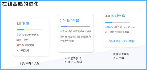 如果将在线合唱技术的演进按阶段划分,可以分为轮唱、“伪”合唱、实时合唱三个阶段。