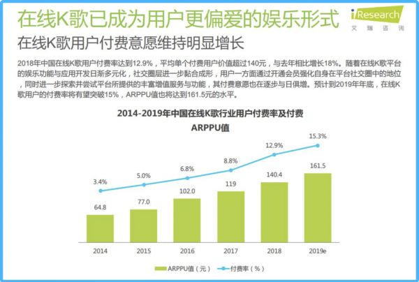 《白皮书》显示,2014年以来在线K歌用户付费意愿维持明显增长;其中,2018年中国在线K歌用户付费率达到12.9%,较2014年涨了2倍多,平均单个付费用户价值超过140元,较2014年翻了一番多;预计2019年这两项数字还在持续增长。