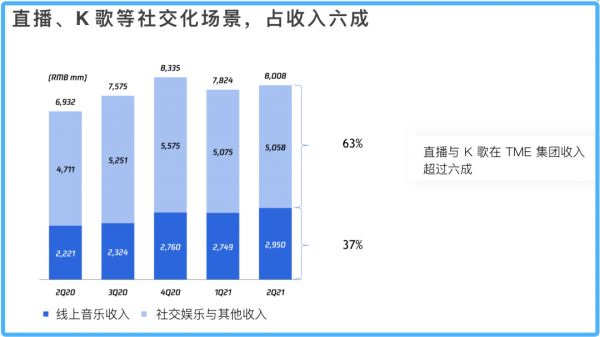从上市企业腾讯音乐的财报中也可以看到,2021年二季度,K歌、直播等业务所在的社交娱乐服务板块,收入占整个集团的超六成;尤其是在社交娱乐服务移动MAU同比下降13.3%的情况下,该服务月度平均单个付费用户价值同比增长了23%,达到153.3元,直接推动该业务板块营收同比增长7.4%,达50.6亿元。