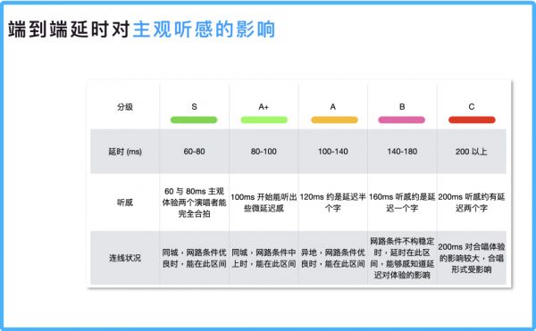 围绕这个技术难题,声网通过对音频在采集端/播放端、网络传输层面以及编解码等环节进行了延时优化,最终实现低至64毫秒(ms)端到端延时的多人实时合唱体验。