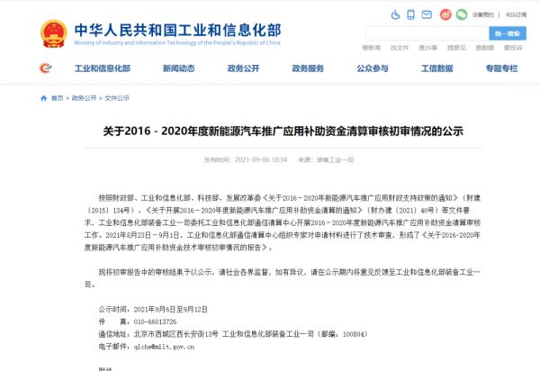 近日,工信部发布《关于2016-2020年度新能源汽车推广应用补助资金清算审核初审情况的公示》。