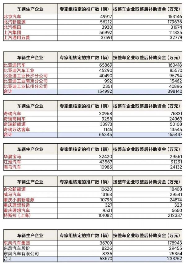 公示显示,北京汽车被核准4.99万辆车,补贴15.31亿元;北汽新能源被核准5.62万辆车,补贴17.96亿元;北汽福田被核准0.39万辆车,补贴3.2亿元;上汽集团被核准5.7万辆车,补贴11.18亿元;东风汽车(含东风汽车集团、东风汽车股份、东风汽车有限公司)被核准5.37万辆,补贴23.38亿元。