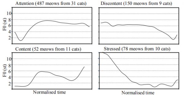 [3]Schötz, Susanne & van de Weijer, Joost & Eklund, Robert. (2019). Melody matters: An acoustic study of domestic cat meows in six contexts and four mental states. 10.7287/peerj.preprints.27926.