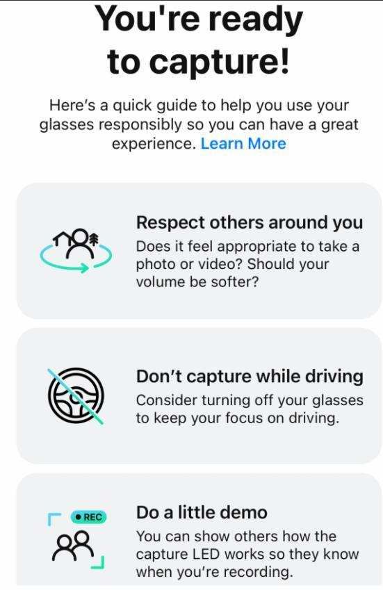 尽管如此,Facebook并不是在假装智能眼镜没有舒适度的障碍需要清除。它的雷朋Stories隐私网页列出了你应该使用电源开关关掉眼镜的地方,从更衣室到做礼拜的场所;View应用程序包括许多礼仪提示,比如鼓励顾客在拍照前演示现在正在录制的LED是如何工作的。Facebook硬件部门产品总监马修·西马利(Matthew Simari)说,这样的功能是为了促使任何购买眼镜的人成为“一个好管家,在行为上考虑周到”。